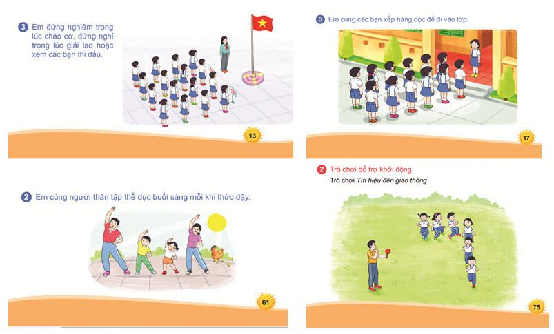 Ví dụ Hoạt động chào cờ (trang 13), Xếp hàng vào lớp (trang 17), Cùng người thân tập thể dục buổi sáng (trang 61), Trò chơi Tín hiệu đèn giao thông (trang 75)...