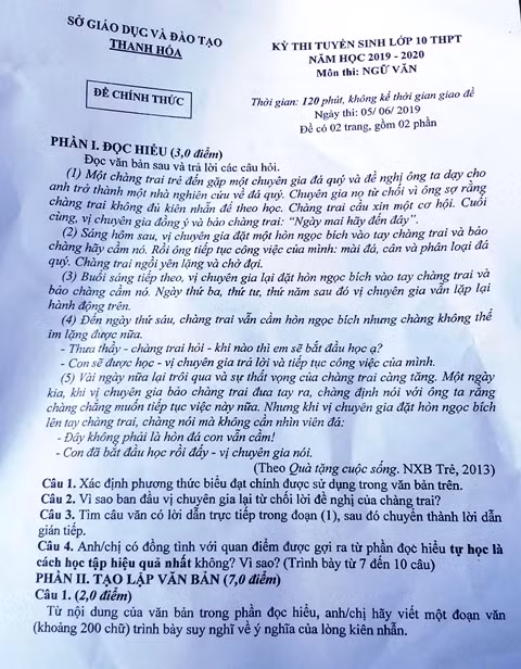 Theo lịch thi, sáng mai (6/6), thí sinh dự thi vào lớp 10 THPT trên địa bàn tỉnh Thanh Hóa sẽ kết thúc kỳ thi với môn Tiếng Anh, thời gian làm bài là 60 phút (7h55 phút phát đề, 8h bắt đầu làm bài).
