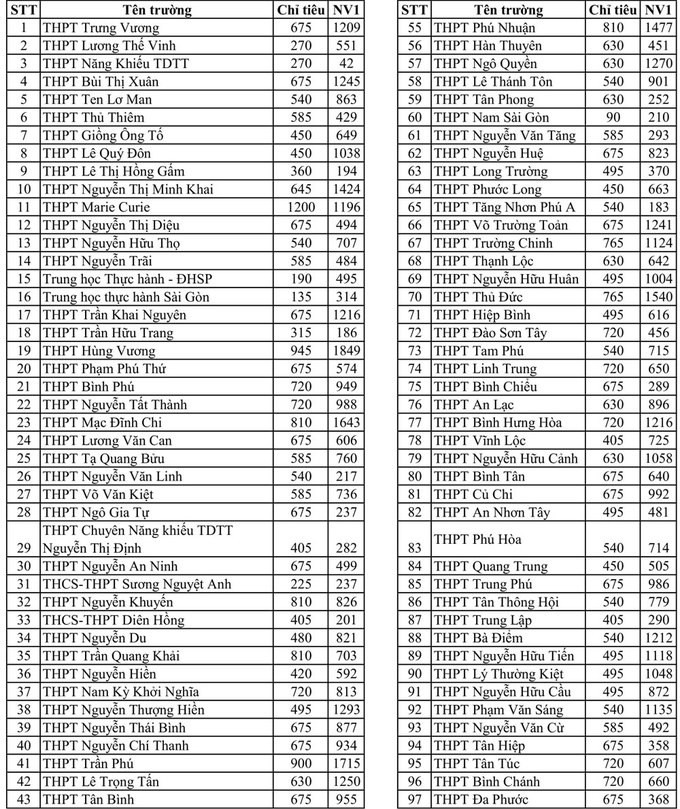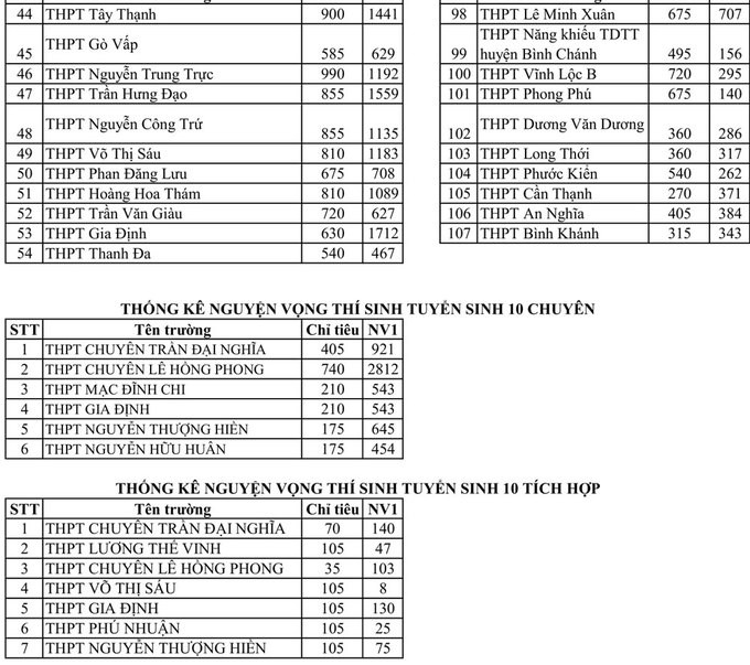 Theo thống kê của Sở GD&ĐT, nhiều trường THPT có số thí sinh đăng ký nguyện vọng 1 rất cao, như: Trường THPT Gia Định: 1712/630 chỉ tiêu; Trường THPT Trần Phú: 1715/900 chỉ tiêu; Trường THPT Mạc Đĩnh Chi 1643/810 chỉ tiêu;...
