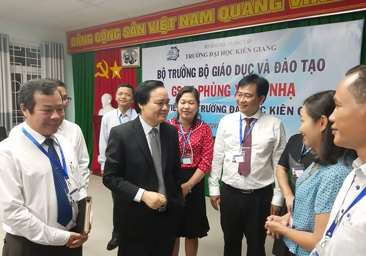 Làm việc với lãnh đạo, cán bộ, giảng viên Trường ĐH Kiên Giang, Bộ trưởng Bộ GD&ĐT Phùng Xuân Nhạ đánh giá cao sự tăng trưởng nhanh chóng của một trường đại học ở địa phương chỉ sau 5 năm thành lập.