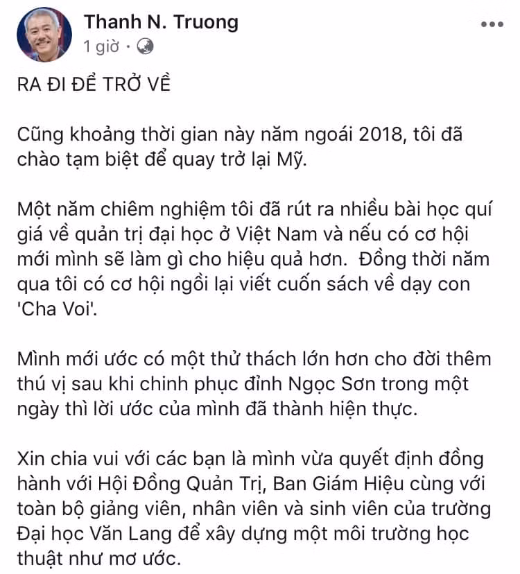 Chia sẻ về quyết định này, GS. Thành viết: "Cũng khoảng thời gian này năm ngoái 2018, tôi đã chào tạm biệt để quay trở lại Mỹ. Một năm chiêm nghiệm, tôi đã rút ra nhiều bài học quí giá về quản trị đại học ở Việt Nam và nếu có cơ hội mới, mình sẽ làm gì cho hiệu quả hơn.