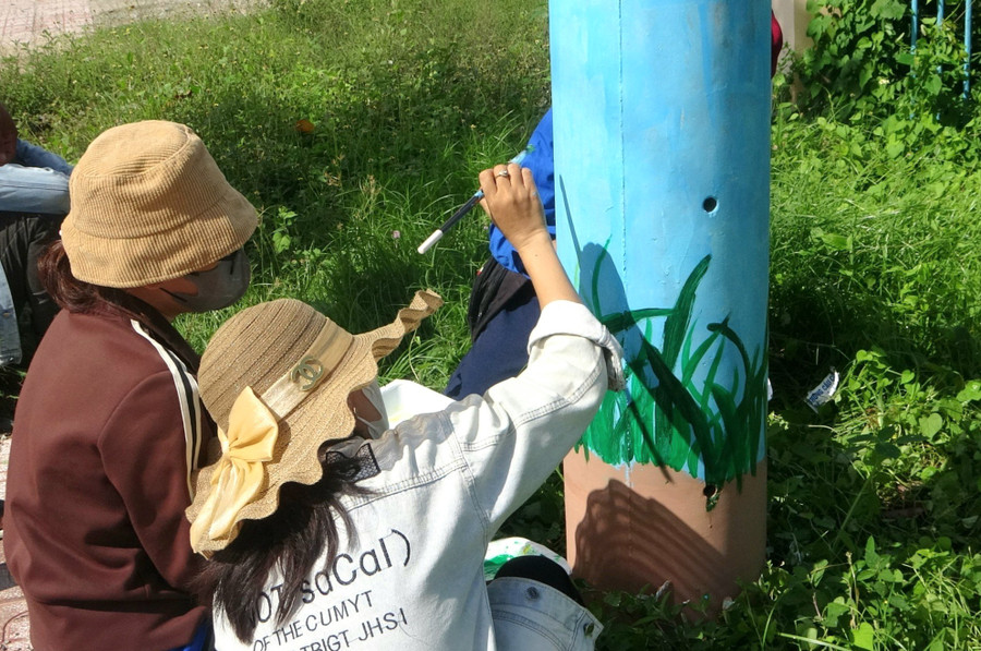 Tham gia Công trình, các giáo viên Mỹ thuật và các đoàn viên thanh niên chia làm nhiều nhóm nhỏ tiến hành phát dọn cỏ xung quanh trụ điện, cạo xóa các mẫu quảng cáo, kiểm tra an toàn lưới điện trước khi vẽ trang trí lên trụ điện tạo vẻ mỹ quan đô thị.