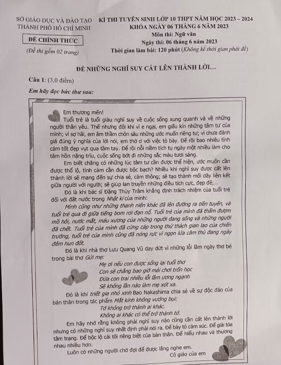 Ở câu 1 ngoài sự mới mẻ về hình thức thì nội dung cũng mới: Nội dung đọc hiểu không trích dẫn 100% mà được dẫn dắt bởi người ra đề. Văn bản đọc hiểu do người ra đề tự viết, đóng vai cô giáo, có trích dẫn các tác phẩm liên quan đến chủ đề “Những suy nghĩ cất lên thành lời”. Các câu hỏi không khó, đây là phần hầu hết học sinh có thể lấy điểm. Câu d mang tính giáo dục cao đồng thời tôn trọng ý kiến chủ quan của học sinh, không áp đặt.