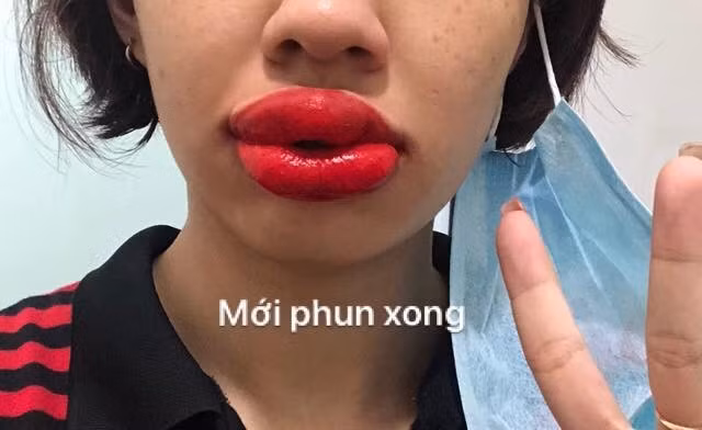 Ngay khi mới phun xong, đôi môi của cô đã sưng méo, lệch cả mồm.
