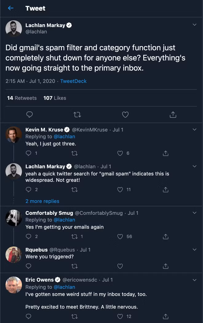 | Trên mạng xã hội Twitter, nhiều người dùng xác nhận gặp vấn đề về bộ lọc thư rác trong Gmail. Ảnh: Chụp màn hình. |