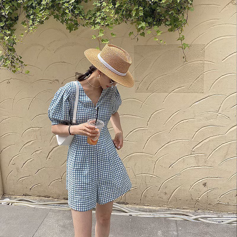 Diện một bộ jumpsuit hoạ tiết gingham chiết eo cũng là một gợi ý ăn diện hợp lý trong hè, vì vừa mát mẻ, vừa giúp phong cách trẻ xinh.