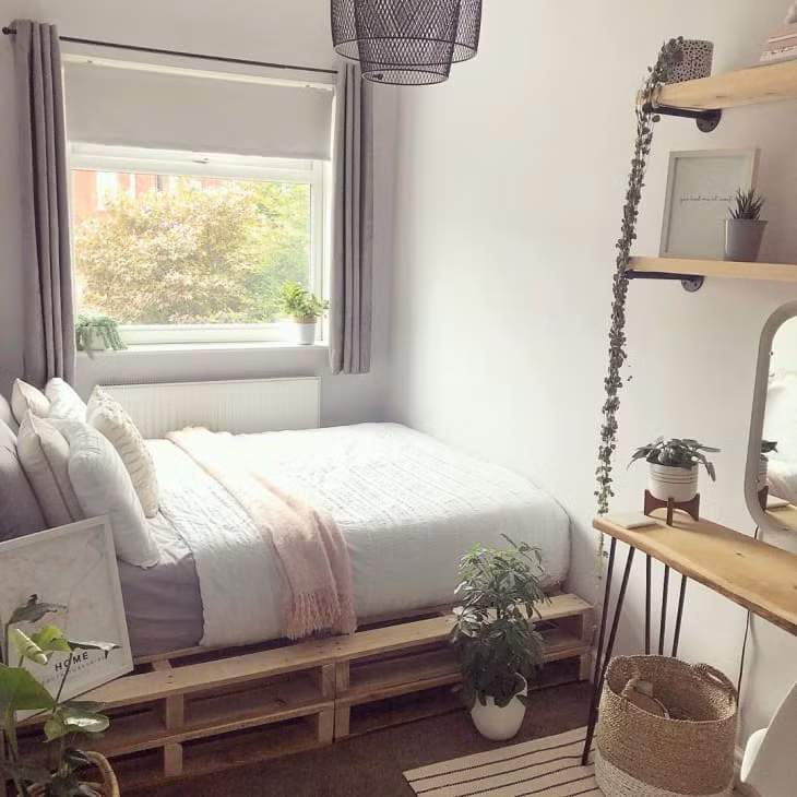 Bạn có thể lựa chọn phong cách Scandinavian cho căn phòng ngủ của mình. Chiếc giường pallet vô cùng dễ dàng để thiết kế gọn gàng trong khu vực gần sát khung cửa sổ.