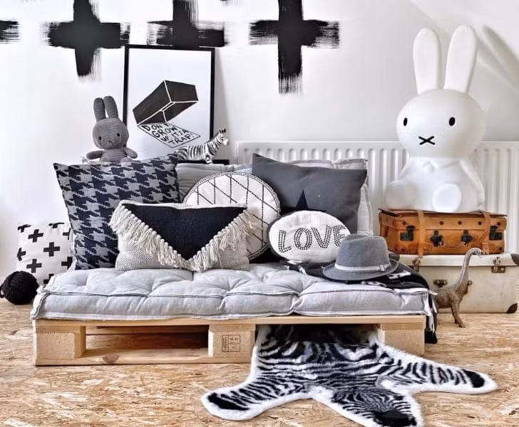 Pallet có thể đóng thành bất kỳ đồ đạc gì mà bạn muốn. Kiểu dáng giường đơn giản dành cho các bé trai được thiết kế nhỏ nhắn, kích thước gọn gàng vừa đủ đặt nệm màu xám.