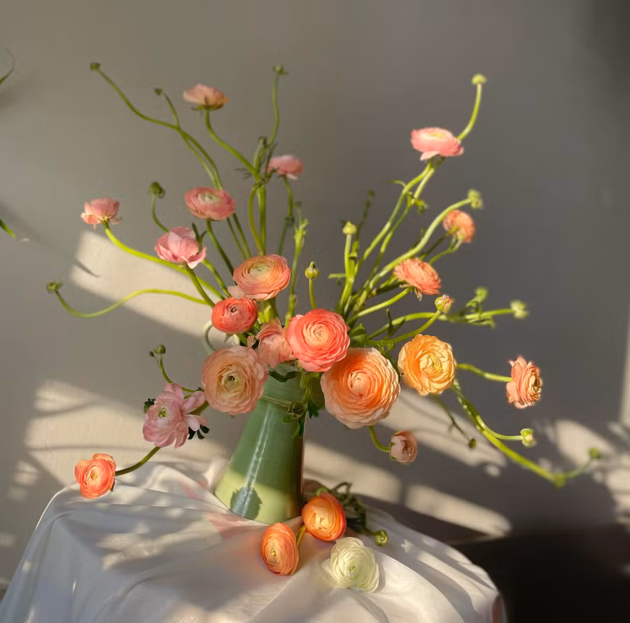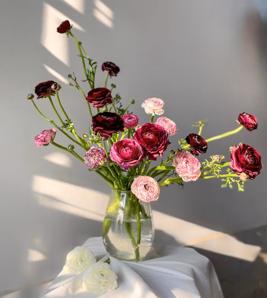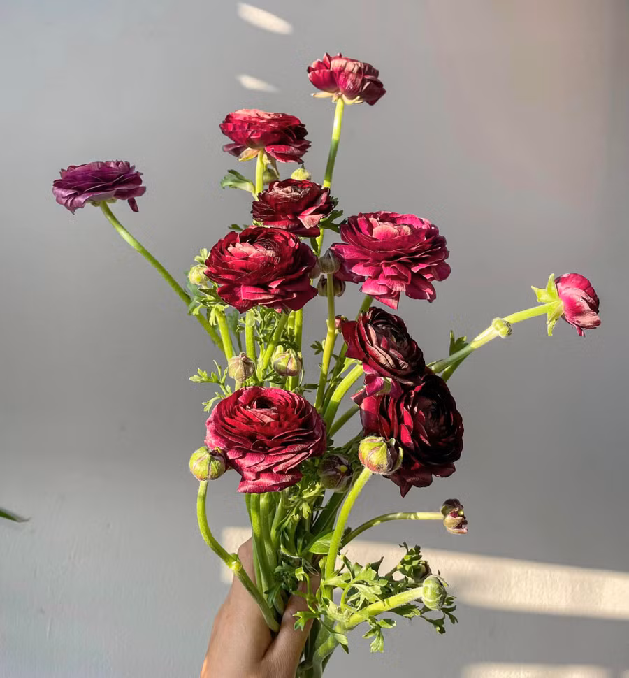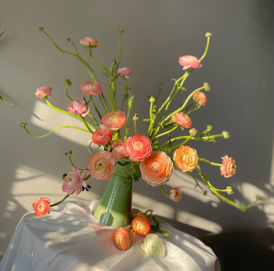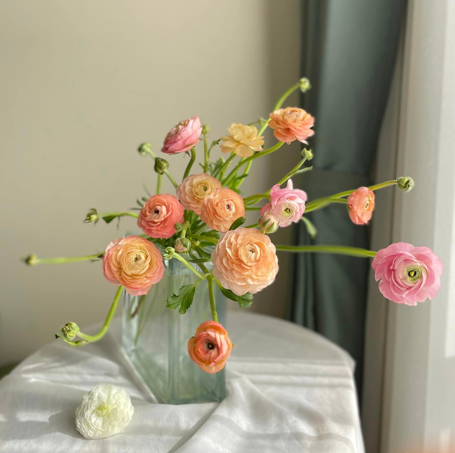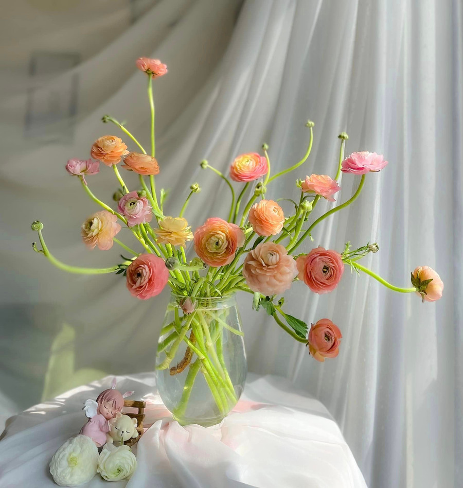 Khi mua về, chị Thủy cắt tỉa hết các lá phụ cho thoáng gốc của nhánh hoa. Tỉa bớt nụ nhỏ, để lại phải nhánh nụ dài tạo độ mềm mại cho bình hoa khi cắm.