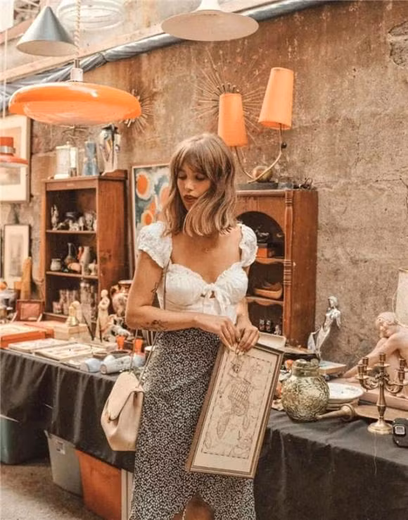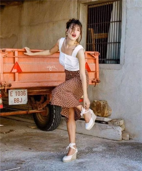 Chọn cùng một kiểu quần áo cho phù hợp sẽ tiết kiệm rất nhiều rắc rối. Áo cổ vuông là một sản phẩm đơn theo phong cách retro, với cùng một chiếc váy chấm bi theo phong cách retro, trông nó mang phong cách retro hơn.