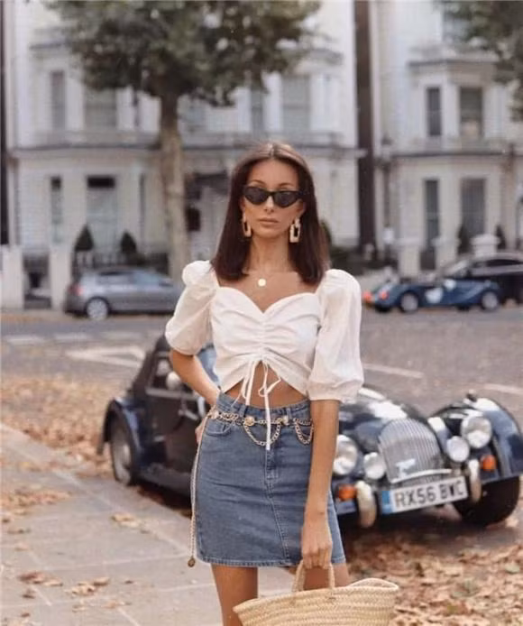 Chọn mặc áo cổ vuông ngắn để lộ phần da eo, với váy xẻ eo cao, gợi cảm và nữ tính.