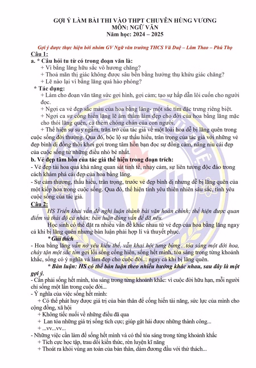Báo GD&TĐ giới thiệu gợi ý đáp án môn Ngữ văn chuyên do nhóm giáo viên Ngữ văn trường THCS Vũ Duệ (huyện Lâm Thao, Phú Thọ) thực hiện.