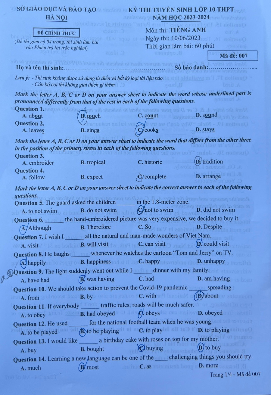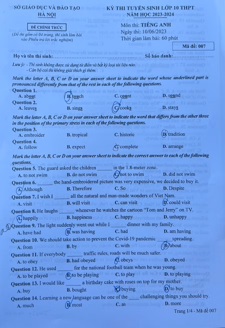Đề thi Tiếng Anh vào lớp 10 THPT Hà Nội (mã đề 007):