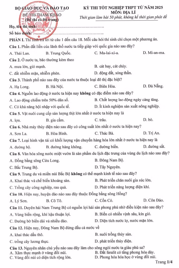 Mời quý độc giả xem đề thi minh họa môn Địa lí Kỳ thi tốt nghiệp THPT 2025 do Bộ GD&ĐT công bố: