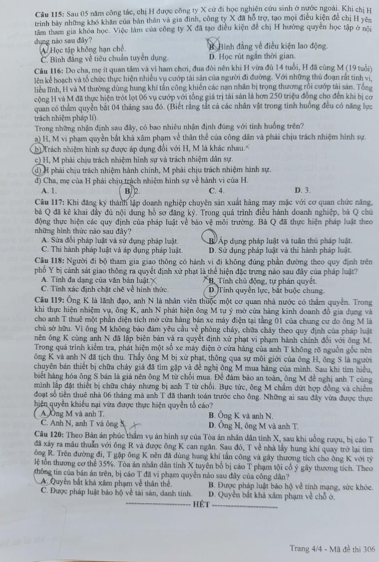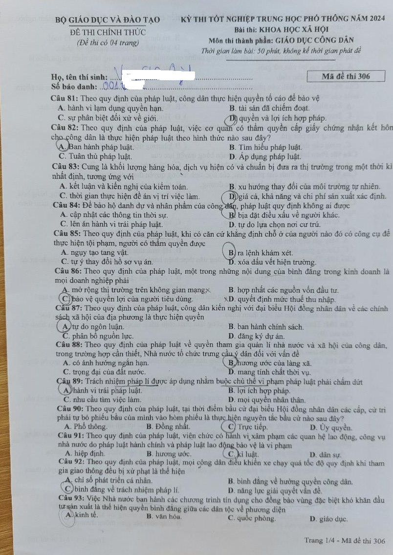 Gợi ý đáp án môn Giáo dục công dân thuộc bài thi tổ hợp KHXH kỳ thi tốt nghiệp THPT 2024 (Lưu ý: Đáp án chỉ mang tính chất tham khảo):