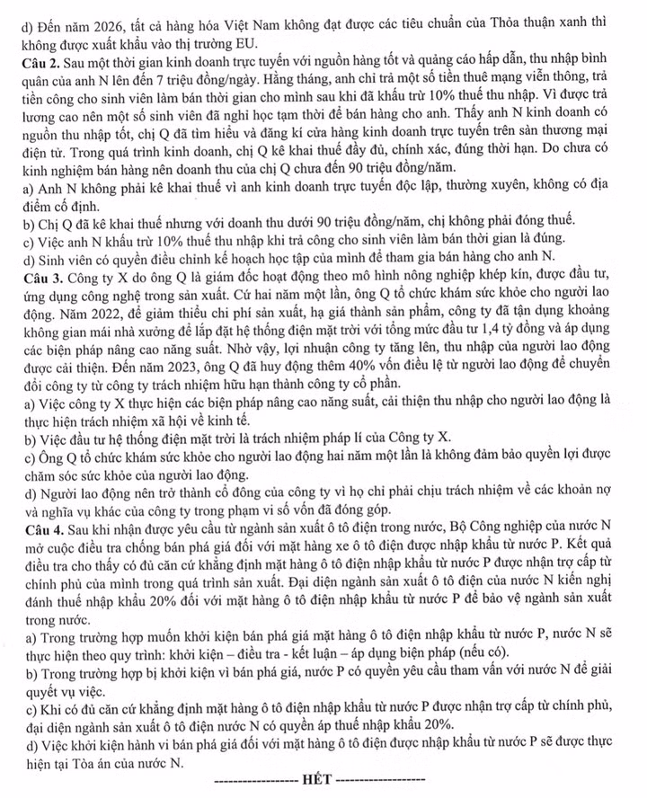 Dưới đây là đề thi minh họa môn Giáo dục kinh tế – Pháp luật do Bộ Giáo dục và Đào tạo công bố. Đề thi bao gồm cả phần trắc nghiệm và các câu hỏi tính toán ở nhiều mức độ, từ nhận biết đến vận dụng cao.