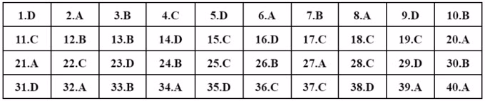 | 31.A | 32.D | 33.C | 34.D | 35.B | 36.B | 37.A | 38.B | 39.A | 40.A |