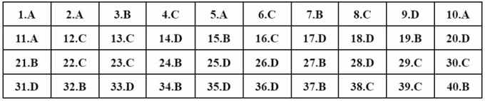 | 31.C | 32.A | 33.B | 34.B | 35.D | 36.B | 37.D | 38.C | 39.C | 40.B |