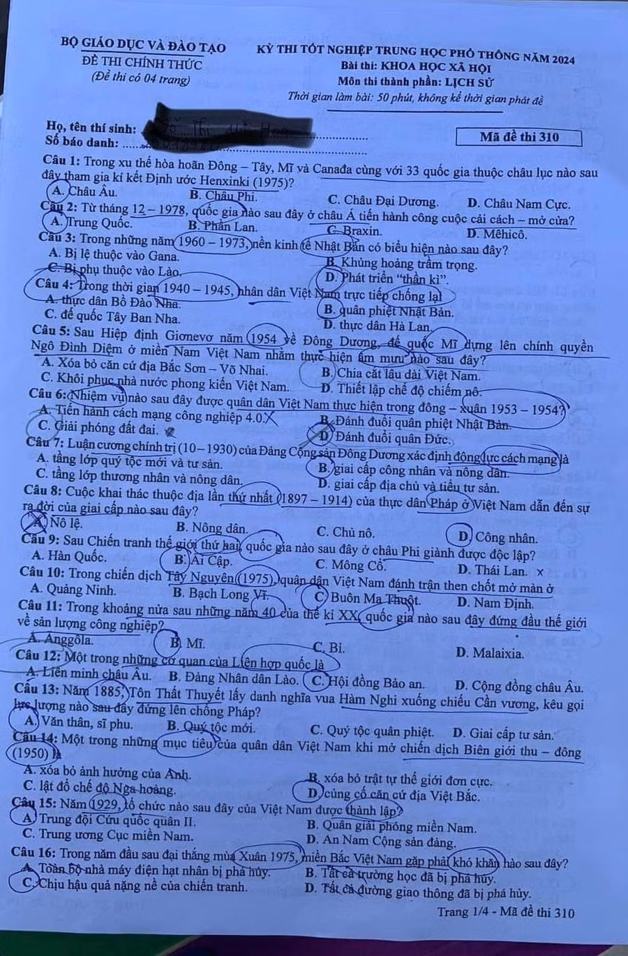 Đề thi môn Lịch sử kỳ thi tốt nghiệp THPT 2024