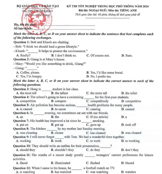 Đề thi môn Tiếng Anh kỳ thi tốt nghiệp THPT 2024