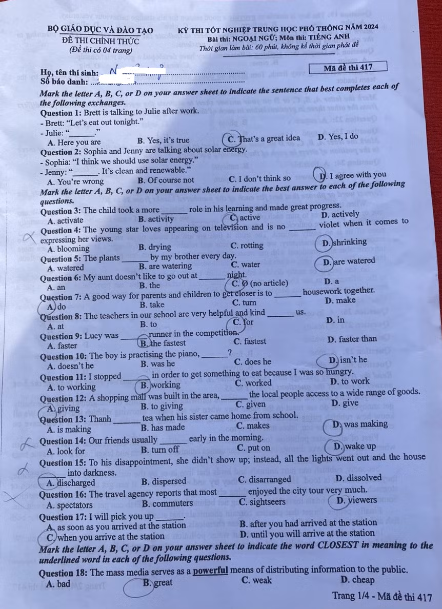Báo Giáo dục và Thời đại xin giới thiệu đáp án tham khảo môn Tiếng Anh (24 mã đề) kỳ thi tốt nghiệp THPT 2024 (thực hiện bởi Ban chuyên môn Tuyensinh247.com):