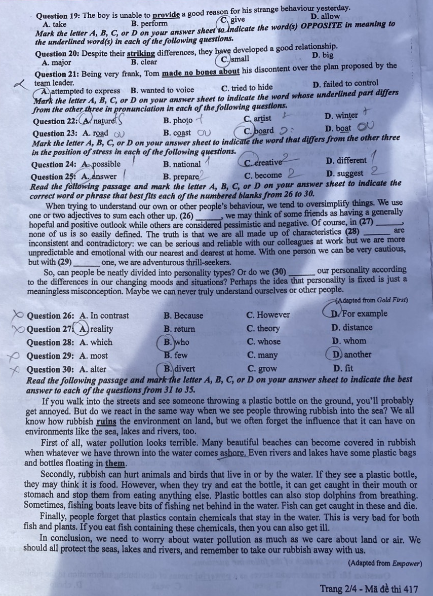 Đáp án đề thi minh họa môn Tiếng Anh 2024 thi tốt nghiệp THPT năm 2024 (Lưu ý đáp án chỉ mang tính chất tham khảo):