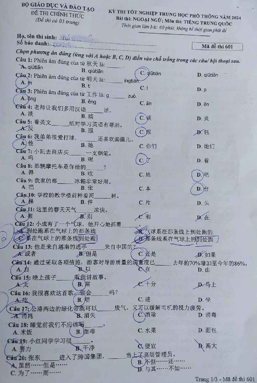| Gợi ý đáp án các mã đề 601 môn Tiếng Trung. |