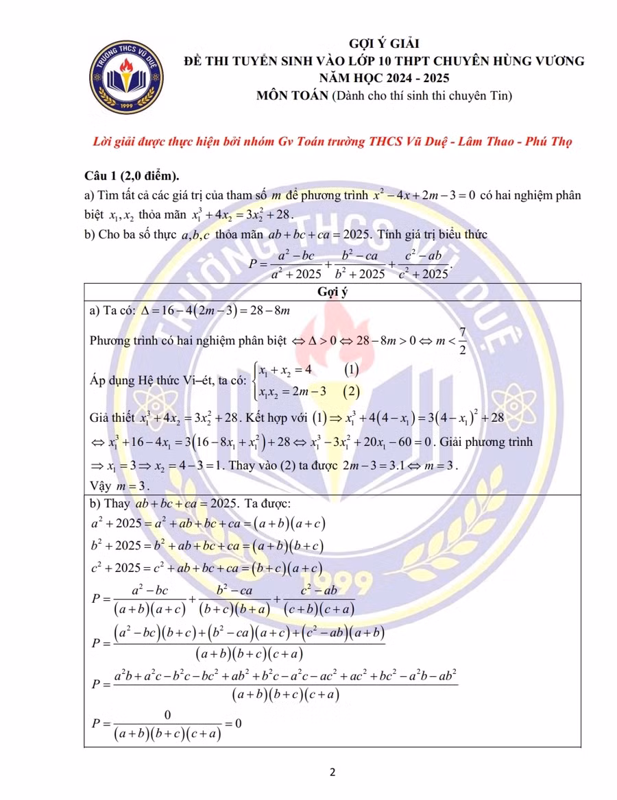 Báo GD&TĐ giới thiệu gợi ý đáp án môn Toán dành cho thi chuyên Tin do nhóm giáo viên Toán trường THCS Vũ Duệ (huyện Lâm Thao, Phú Thọ) thực hiện.