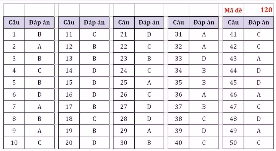 Đáp án tham khảo mã đề 120. Nguồn: Hocmai