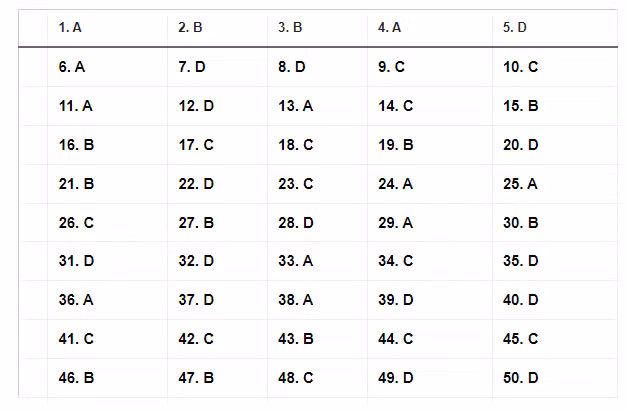 Đáp án tham khảo mã đề 109. Nguồn: Tuyensinh247