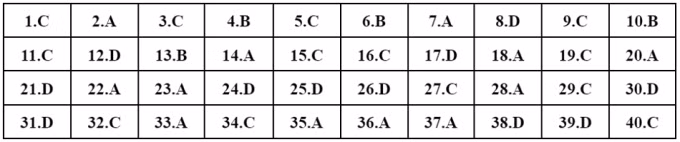 | 31.C | 32.D | 33.A | 34.C | 35.D | 36.A | 37.C | 38.B | 39.A | 40.C |
