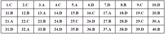 | 31.A | 32.D | 33.B | 34.C | 35.A | 36.C | 37.B | 38.C | 39.C | 40.A |