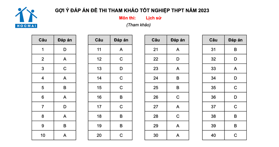 Dưới đây là Đáp án gợi ý đề thi mẫu kỳ thi tốt nghiệp THPT 2023 môn Lịch sử: