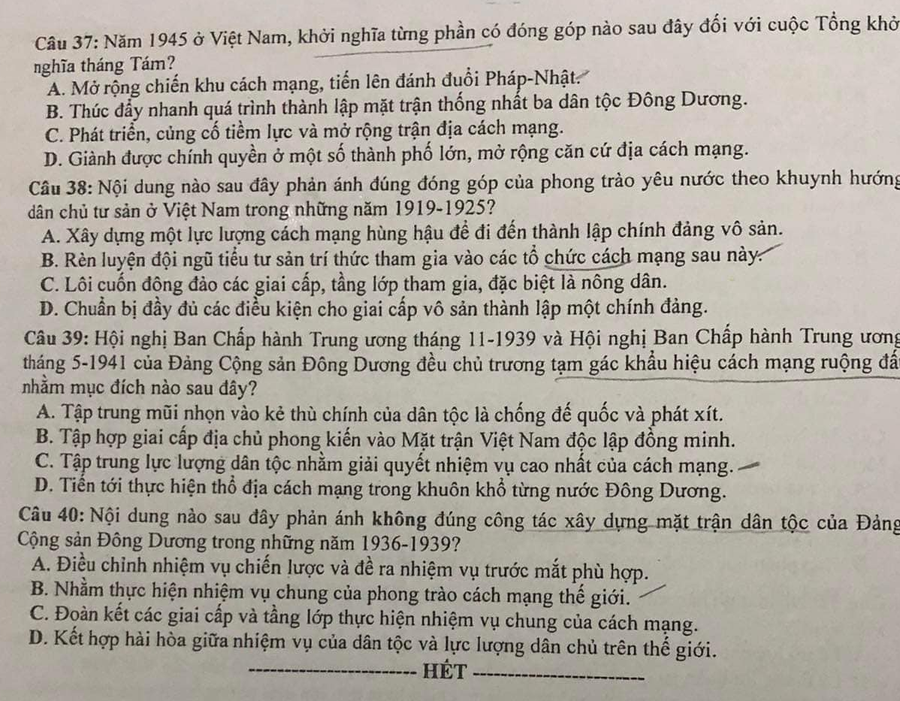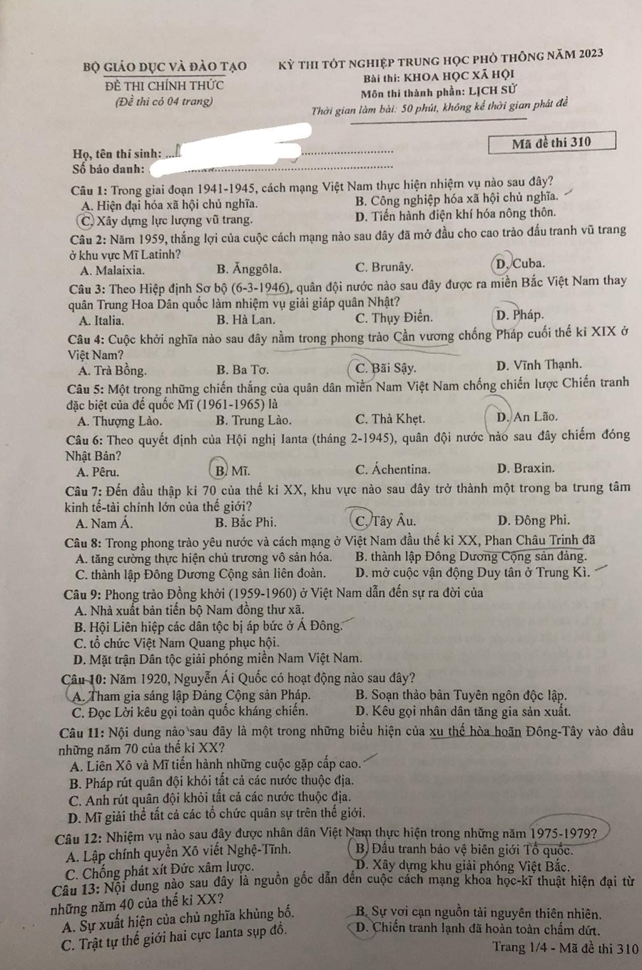 Gợi ý lời giải môn Lịch sử thuộc bài thi tổ hợp KHXH kỳ thi tốt nghiệp THPT 2023 (nguồn ):