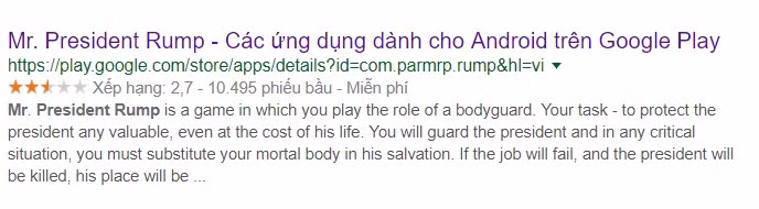 Ứng dụng có tên Mr.President Rump, một tựa game di động xuất bản vào tháng 3/2017 đã chứng kiến lượng tải tăng vọt trong suốt mùa hè. Thậm chí còn có ứng dụng với lượt tải từ 1.000 – 100.000 đã tồn tại trên Play Store trong suốt hai năm mà không bị phát hiện.