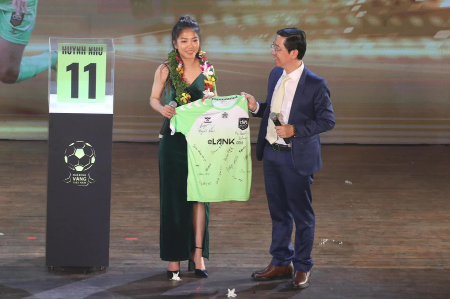 Quả bóng Vàng nữ Việt Nam mặc váy ôm cơ thể khi nhận giải (Ảnh: FBNV).
