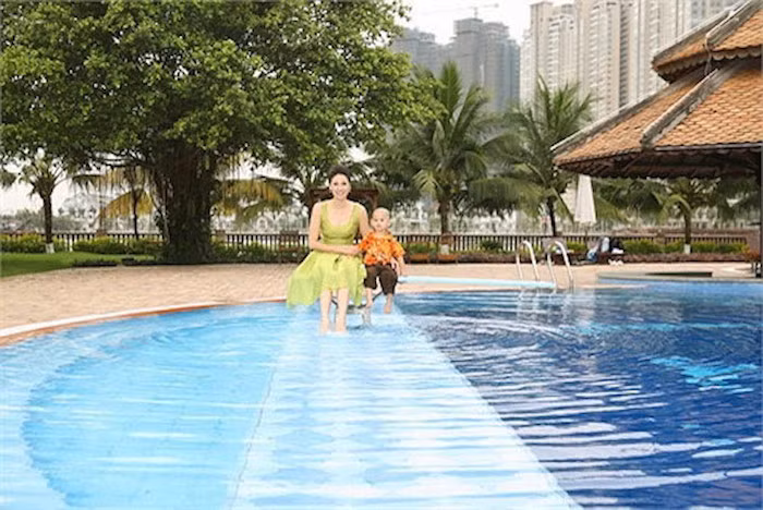 Hồ bơi là nơi hoa hậu chơi đùa cùng con cái hoặc nằm đọc sách.