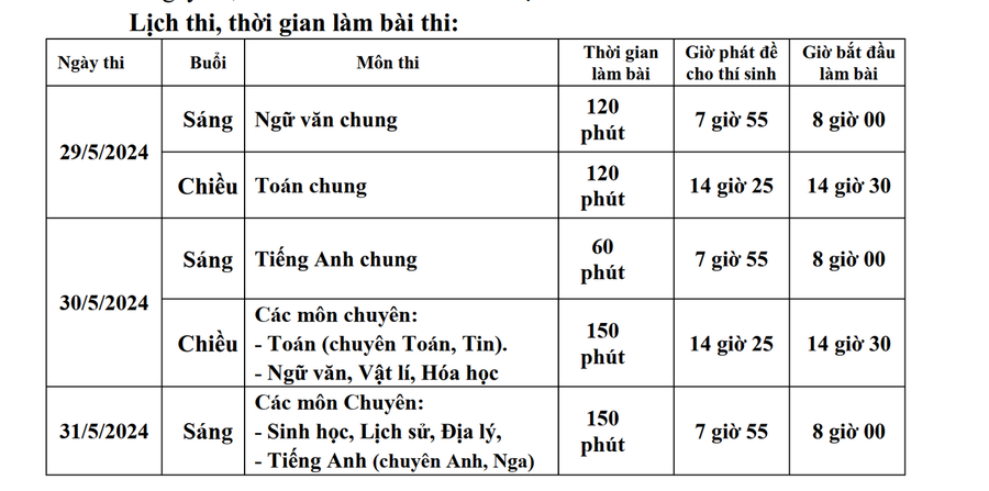 Cũng theo hướng dẫn của Sở GD&ĐT Hà Nam, kỳ thi tuyển sinh vào lớp 10 năm học 2024 - 2025 của Trường THPT chuyên Biên Hòa sẽ diễn ra từ ngày 29-31/5/2024. Lịch thi và thời gian làm bài thi như sau: