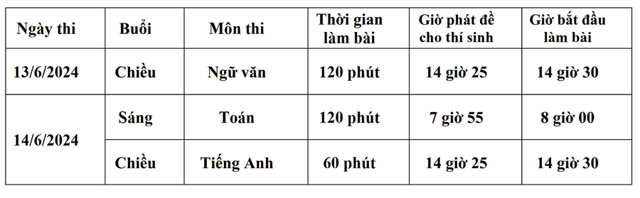 Các bài thi môn Toán và môn Ngữ văn có thời gian làm bài 120 phút; môn Tiếng Anh là 60 phút.