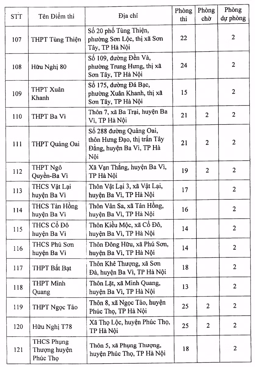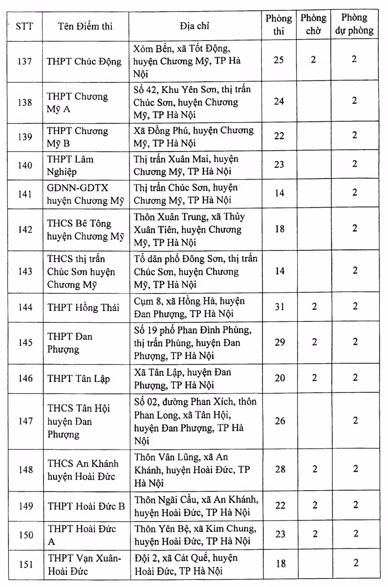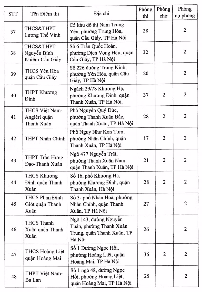 Theo thông báo này, toàn thành phố có 188 điểm thi, điểm thi lớn nhất là THCS Trưng Vương với 45 phòng thi, tiếp theo là THPT Chu Văn An với 43 phòng thi. Địa điểm làm phách bài thi tự luận tại Trường Bồi dưỡng cán bộ quản lý giáo dục Hà Nội. Địa điểm chấm bài thi tự luận tại trường THPT chuyên Hà Nội - Amsterdam. Địa điểm chấm bài thi trắc nghiệm tại Trường Bồi dưỡng cán bộ quản lý giáo dục Hà Nội.