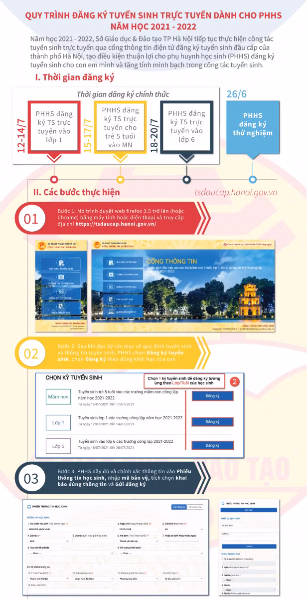 Cụ thể, đăng ký tuyển sinh vào lớp 1 từ ngày 12/7 đến hết ngày 14/7/2021; đăng ký tuyển sinh trẻ 5 tuổi vào trường mầm non từ ngày 15-7 đến hết ngày 17/7/2021; đăng ký tuyển sinh vào lớp 6 từ ngày 18/7 đến hết ngày 20/7/2021. Phụ huynh đăng nhập vào Cổng thông tin tuyển sinh http://tsdaucap.hanoi.gov.vn để đăng ký tuyển sinh trực tuyến.