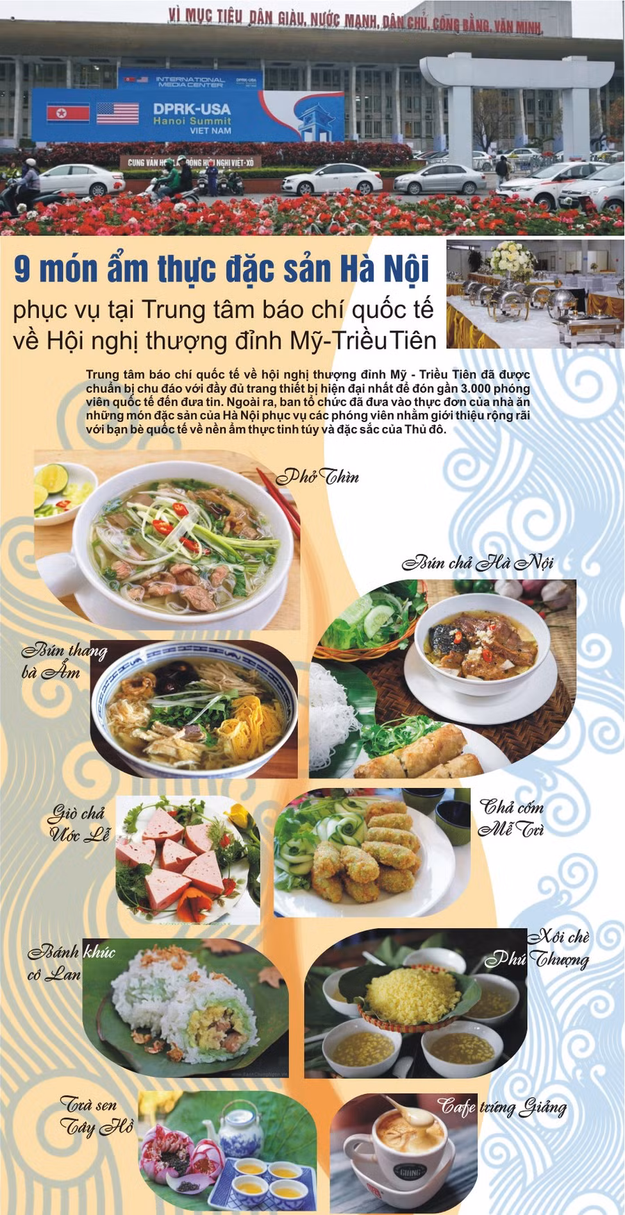 Ngày 25/2, Sở Văn hóa và Thể thao Hà Nội cho biết, trong dịp diễn ra Hội nghị Thượng đỉnh Hoa Kỳ - Triểu Tiên lần hai, Hà Nội sẽ giới thiệu, quảng bá các món ẩm thực truyền thống phục vụ miễn phí các phóng viên tại Trung tâm báo chí của Hội nghị.