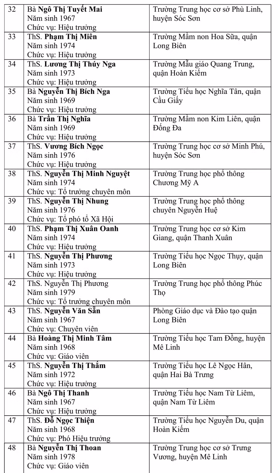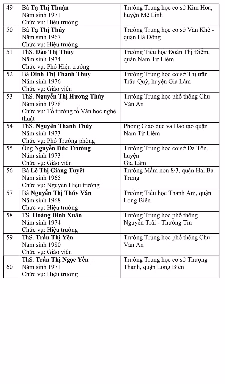 60 nhà giáo được đề nghị xét tặng danh hiệu Nhà giáo ưu tú là các giáo viên, cán bộ quản lý giáo dục trên địa bàn thành phố, một số nhà giáo đã nghỉ hưu. Nhà giáo được xét tặng danh hiệu Nhà giáo ưu tú trẻ nhất là Ths Trần Thị Yên (sinh năm 1980)- giáo viên Trường THPT Chu Văn An.