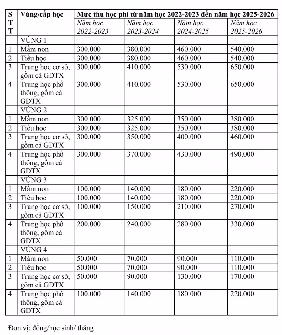 Năm học tới, dự kiến mức học phí của các cấp học từ mầm non đến THPT tại các quận nội thành là 300.000đ/ tháng. Mức học phí này giảm dần tại các xã nông thôn, miền núi. Trừ cấp THPT vùng 1 và 2 có mức học phí tăng nhẹ, từ 217.000 đồng (năm 2021) lên 300.000 đồng, học phí các bậc còn lại đều tăng khoảng gấp đôi năm ngoái.