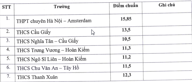 Cụ thể gồm: Trường THCS Chu Văn An (quận Tây Hồ), Trường THCS Thanh Xuân (quận Thanh Xuân), Trường THCS Cầu Giấy (quận Cầu Giấy), Trường THCS Nghĩa Tân (quận Cầu Giấy), Trường THCS Trưng Vương (quận Hoàn Kiếm), Trường THCS Ngô Sĩ Liên (quận Hoàn Kiếm) và lớp 6 THCS của Trường THPT chuyên Hà Nội - Amsterdam.