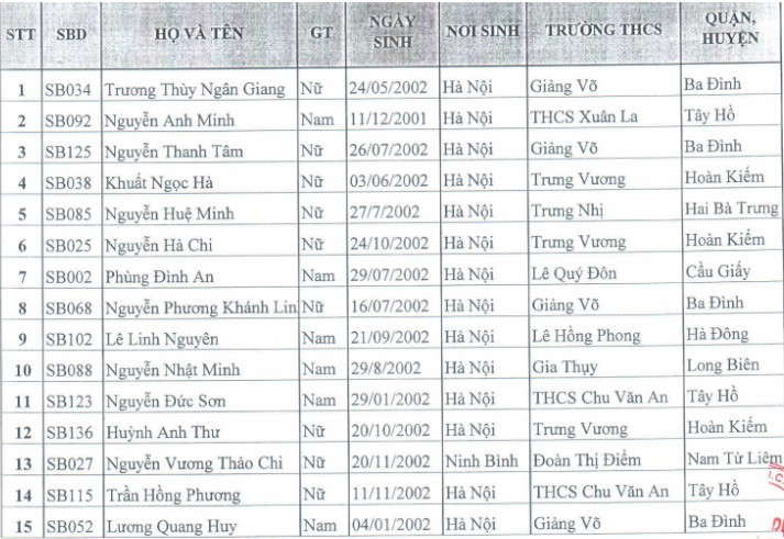 Danh sách 15 thí sinh trúng tuyển cụ thể như sau: