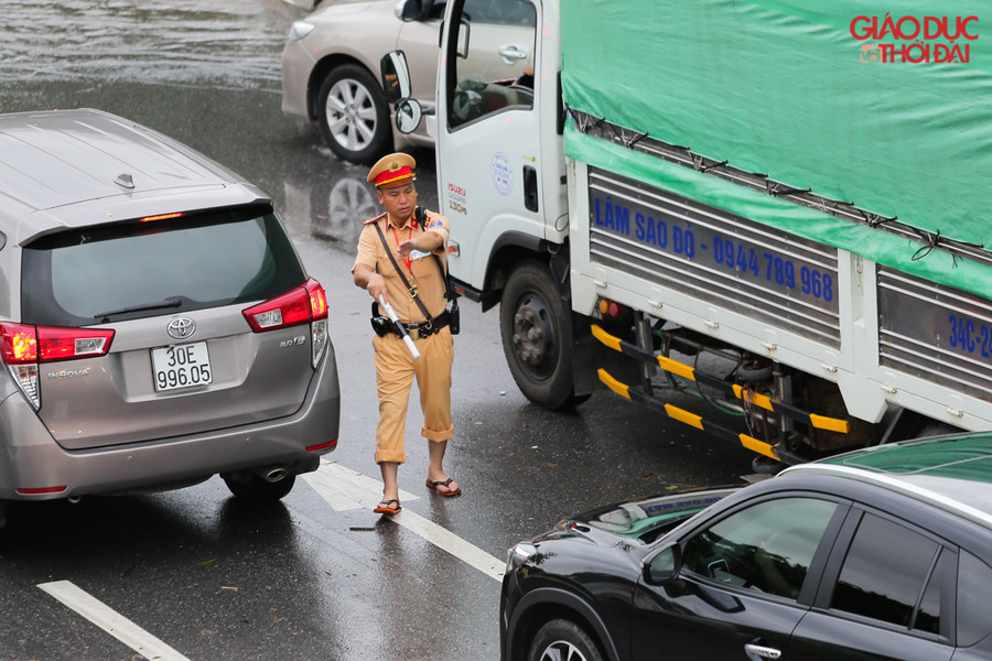 | Những chiến sĩ CSGT đã bỏ cả giầy để đứng phân làn giữa trời mưa, ngập |