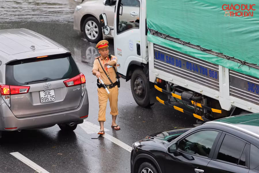 | Lực lượng CSGT chân trần ngâm nước mưa hàng giờ đồng hồ để phân luồng giao thông tại những khu vực "đường đã thành sông" |