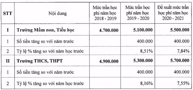 Theo đó, trong năm học tới, mức trần học phí trường mầm non, tiểu học là 5,5 triệu đồng, THCS và THPT là 5,7 triệu đồng, tăng 400.000 đồng so với năm 2019-2020.