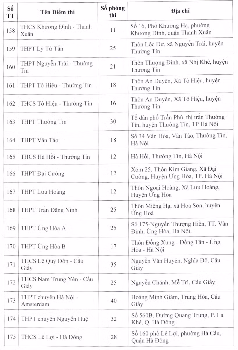 Toàn thành phố có 184 điểm thi vào lớp 10 THPT công lập đặt tại các trường THCS, THPT, bảo đảm các điều kiện cần thiết để tổ chức kỳ thi an toàn về mọi mặt. Số lượng và địa điểm thi có thể còn có sự điều chỉnh căn cứ vào diễn biến thực tế của dịch Covid-19.